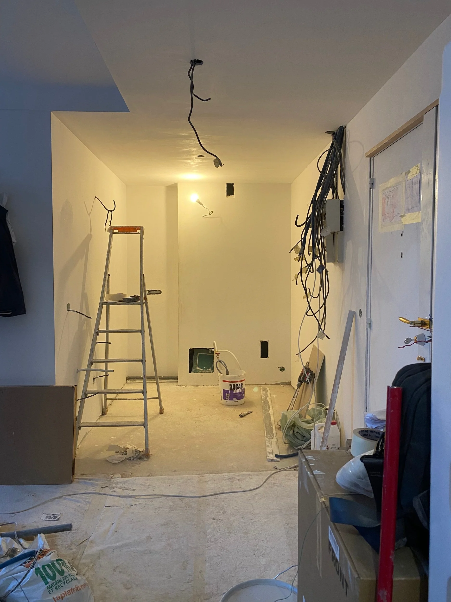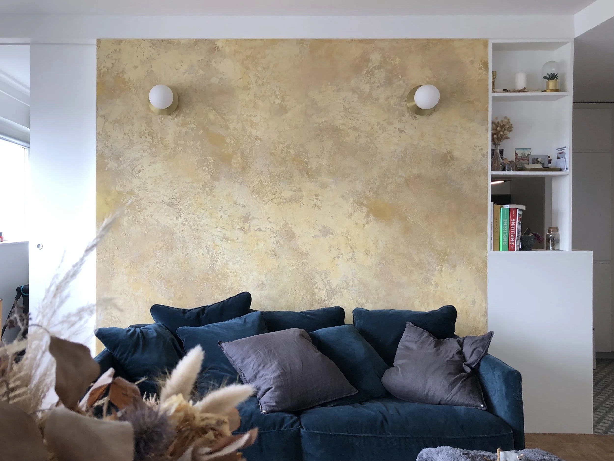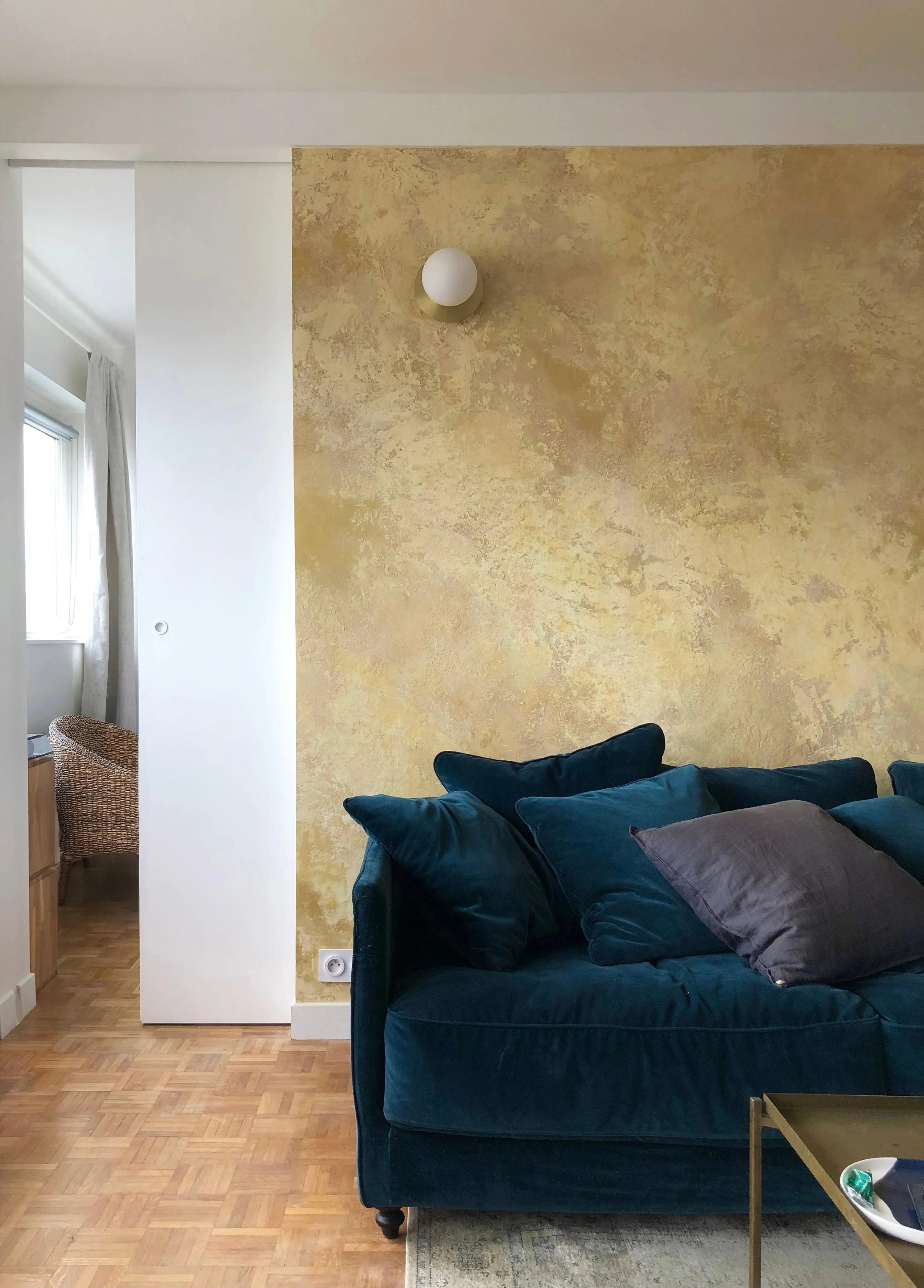 L’intervention de la peintre-matiériste Mayeul Gauvin complète la notre : un enduit plâtre teinté et une peinture végétale habillent la cloison pivot de l’appartement d’une vibration dorée.
