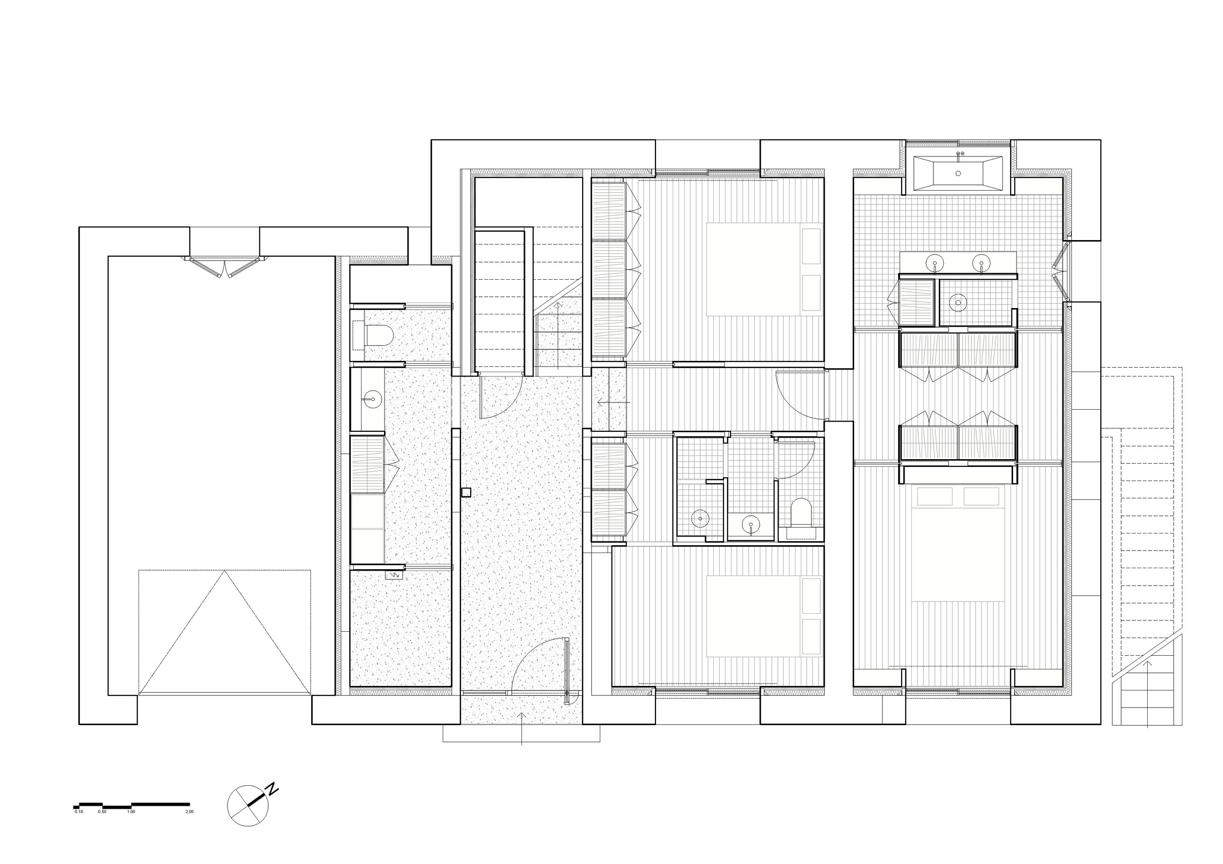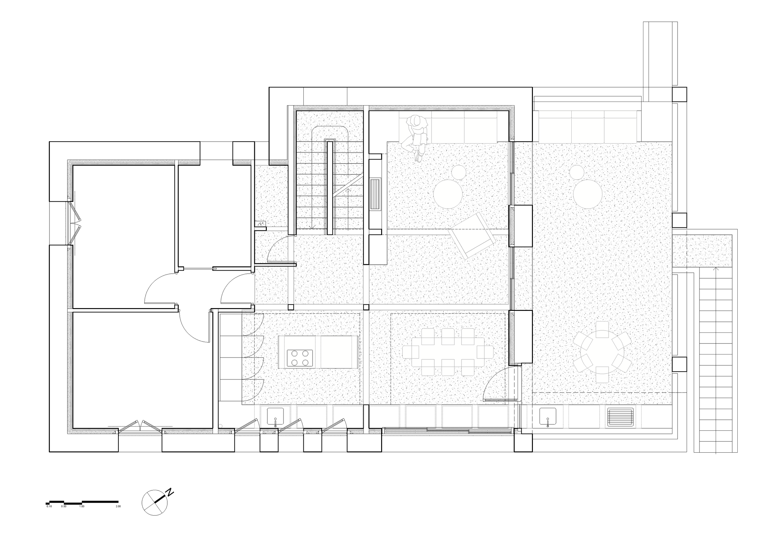 Le rez-de-jardin, originellement conçue pour des pièces secondaires de stockage et de vide sanitaire, est entièrement remanié en sous œuvre, pour y aménager des chambres et leurs pièces d’eau. Les façades sont largement ouvertes pour faire entrer la lumière et surtout, pour retrouver des relations avec le jardin par des accès de plain-pied depuis chaque pièce.