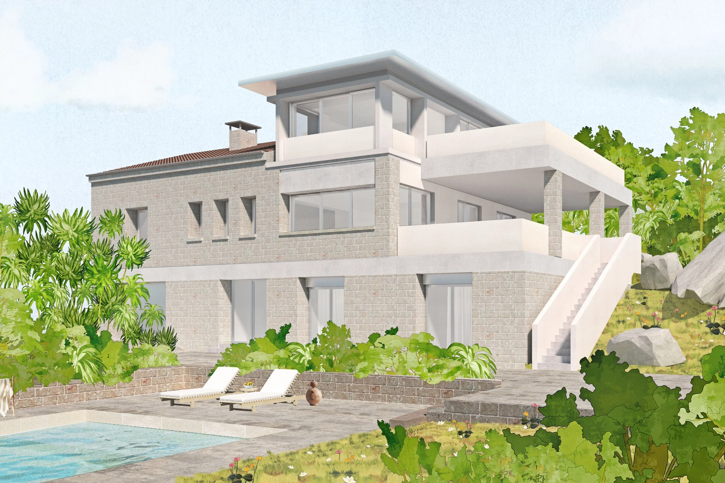 Le projet consiste à transformer et surélever une maison familiale en pierre, posée au milieu d’un jardin parsemé de blocs de granit caractéristiques du paysage du golfe de Porto Vecchio. Notre approche commence d’abord par un travail d’archive pour retrouver les circulations et les trames originelles que le projet propose de faire réémerger.