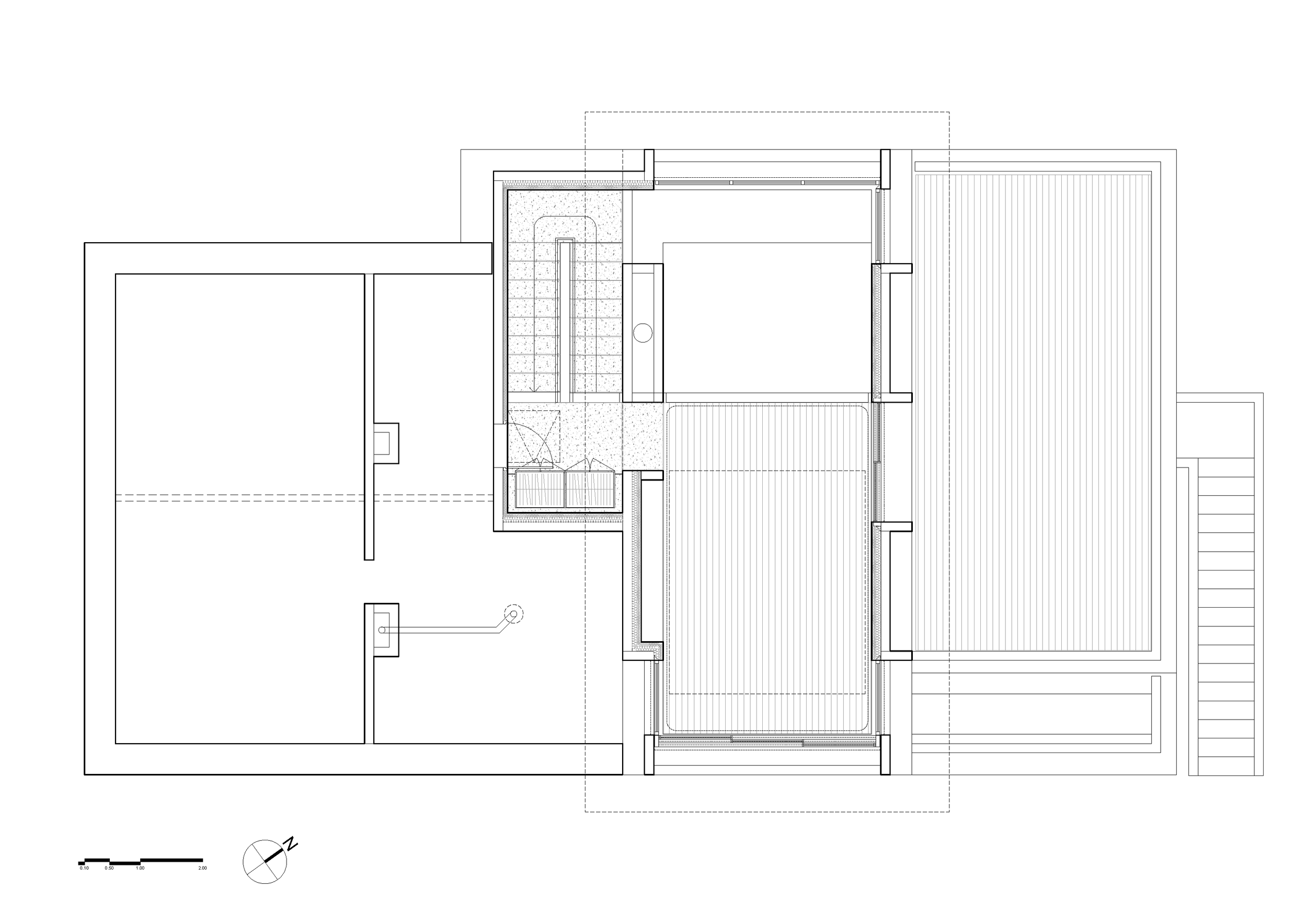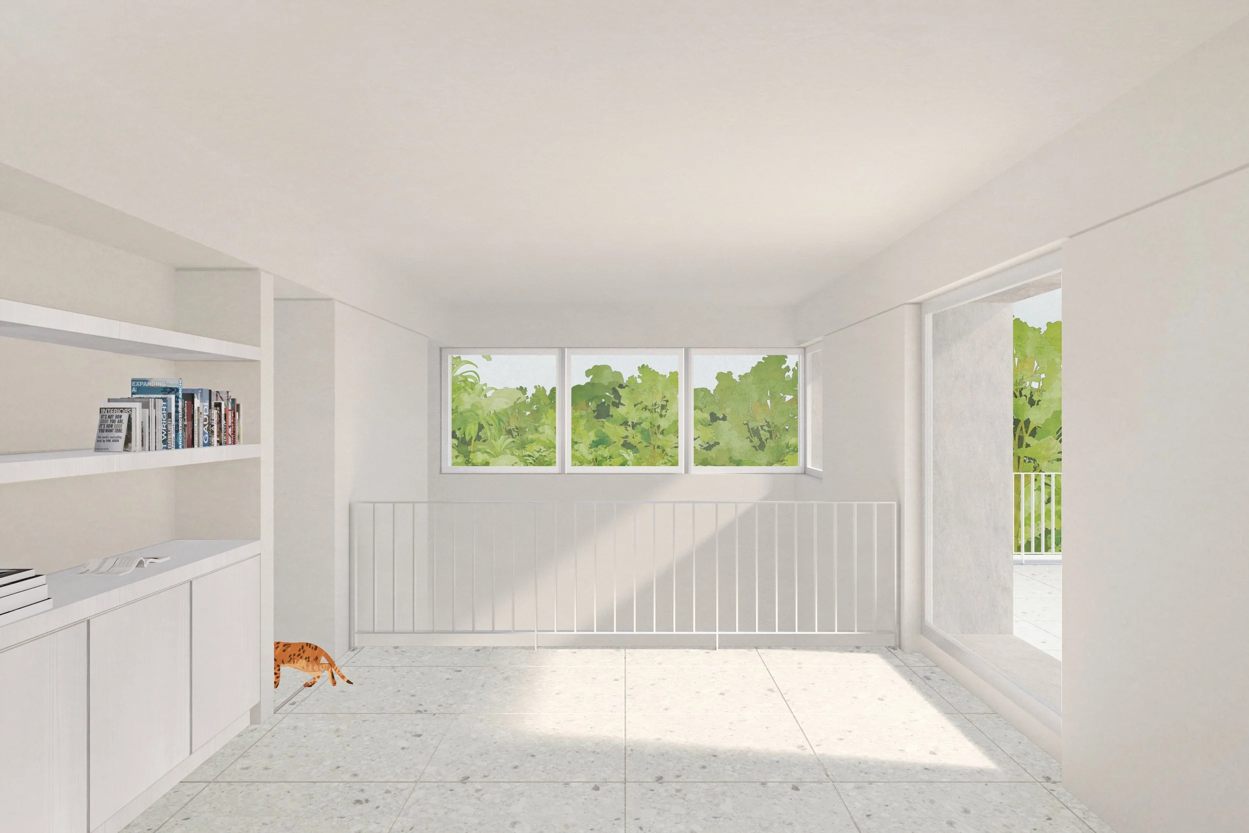 La surélévation, à la manière d’une villa belle époque, est pensée comme un belvédère construit au dessus de la cime des arbres, et donnant accès à un solarium. De la haut, le grand paysage se dévoile, et au loin, la mer apparait.